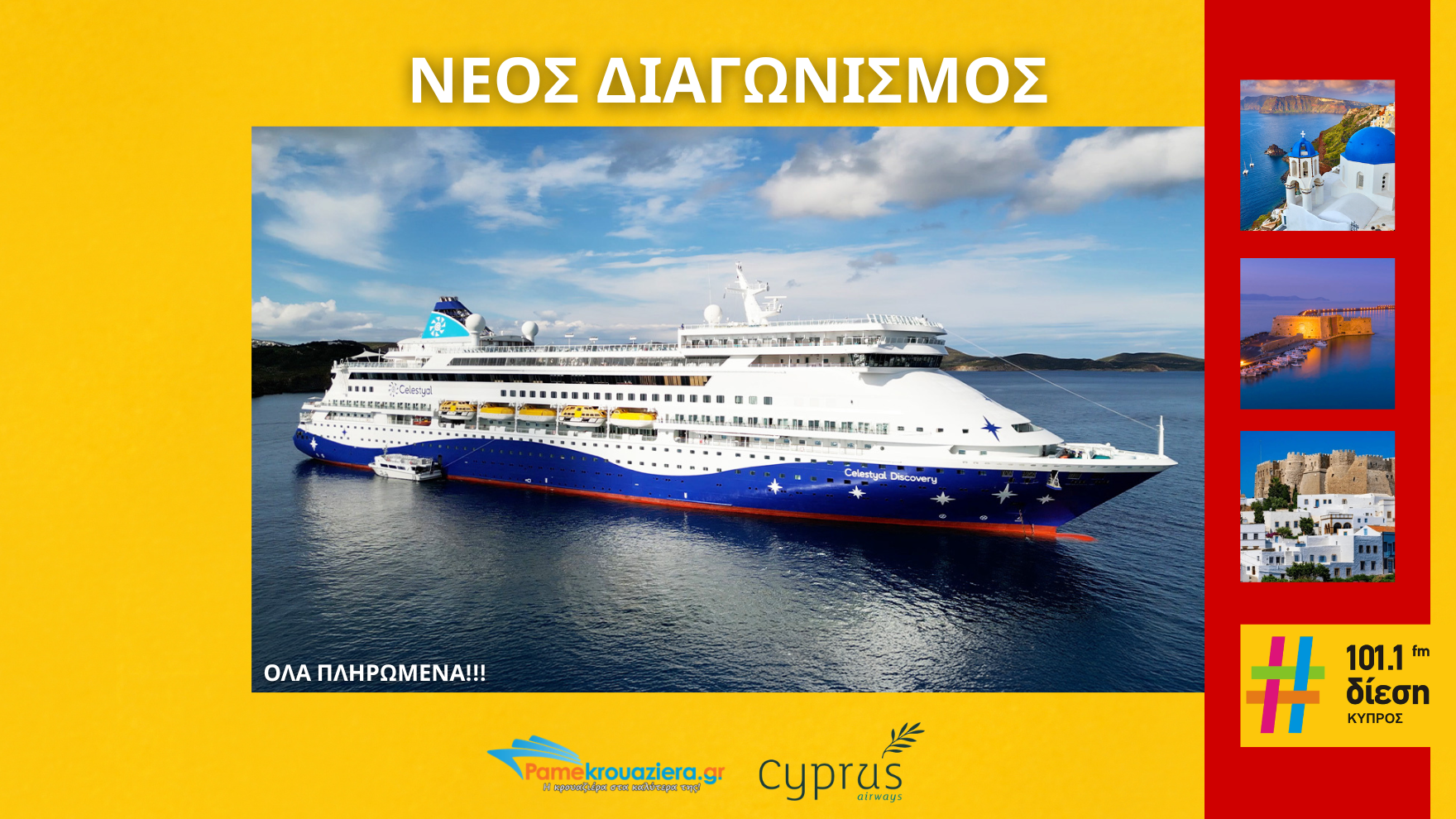 Για την προωθητική ενέργεια «ΔΙΕΣΗ 101,1» η εταιρεία με την επωνυμία «ΠΛΗΡΟΦΟΡΙΑΚΗ & ΠΟΛΙΤΙΣΤΙΚΗ ΕΤΑΙΡΕΙΑ Ο ΛΟΓΟΣ», σε συνεργασία με το pamekrouaziera.gr διοργανώνουν με διακριτικό τίτλο «ΝΕΟΣ ΜΕΓΑΛΟΣ ΔΙΑΓΩΝΙΣΜΟΣ» – «Τριήμερη Πασχαλινή Κρουαζιέρα σε Μύκονο, Κουσάντασι, Πάτμο, Ηράκλειο Κρήτης και Σαντορίνι». Στο πλαίσιο των ραδιοφωνικών εκπομπών και των αναρτήσεων στην ιστοσελίδα www.diesicyprus.com.cy και των μέσων κοινωνικής δικτύωσης (social media) του σταθμού, ο Διοργανωτής διεξάγει, με αποκλειστική δική του ευθύνη, προωθητική ενέργεια με τη συμμετοχή ακροατών, κατά τα κατωτέρω αναφερόμενα.